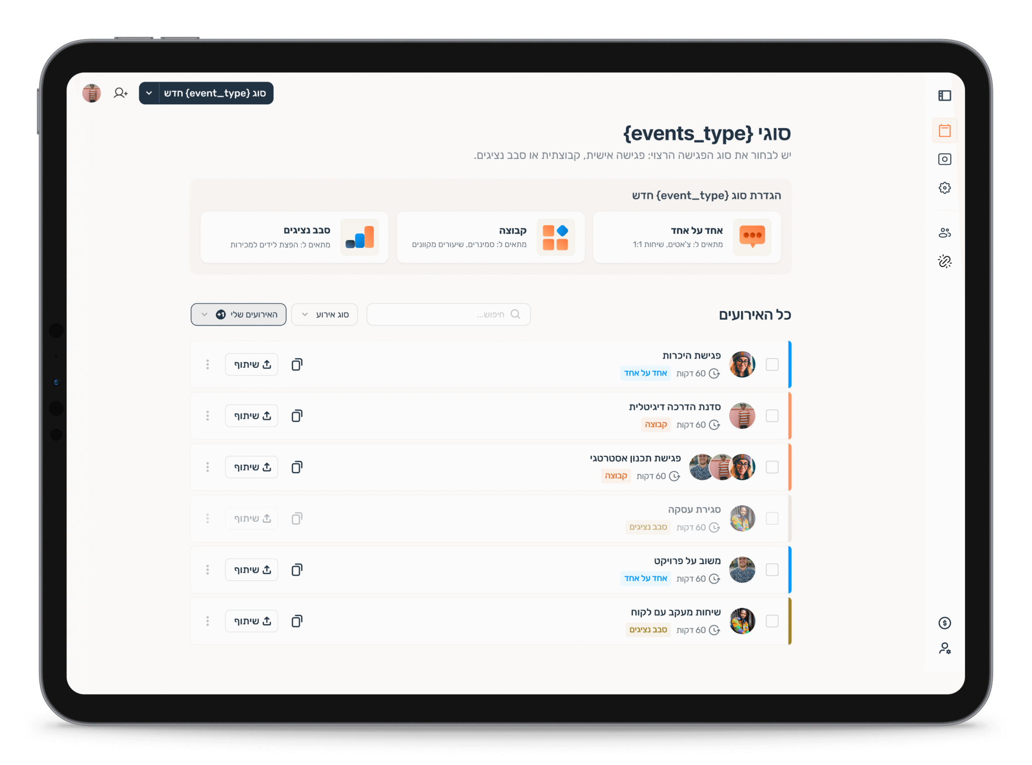 פלטפורמה חכמה לניהול פגישות, תורים, אימונים, טיפולים עבור עסקים, יועצים וצוותים.